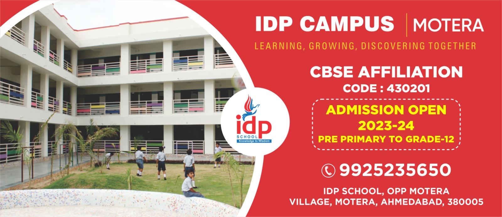 I.D.P school, Motera is a co-educational school which offers CBSE board . The school has partnered with " teach next " to bring in world-class technology enable educational infrastructure and learning environment to support curriculum delivery. I.D.P intends to inculcate practical learning environment to make education more meaningful.